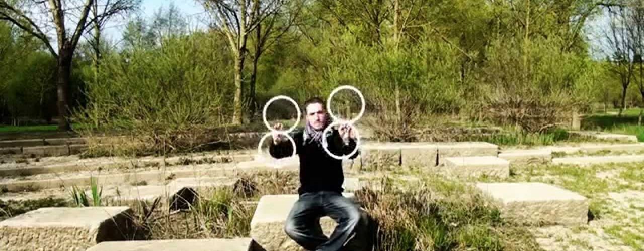 The objects with which this Frenchman is creating these illusions are rings shaped like the number 8, the first, giving the illusion that one ring rotates around the other and the other being the illusion of the rings both flying and standing still.