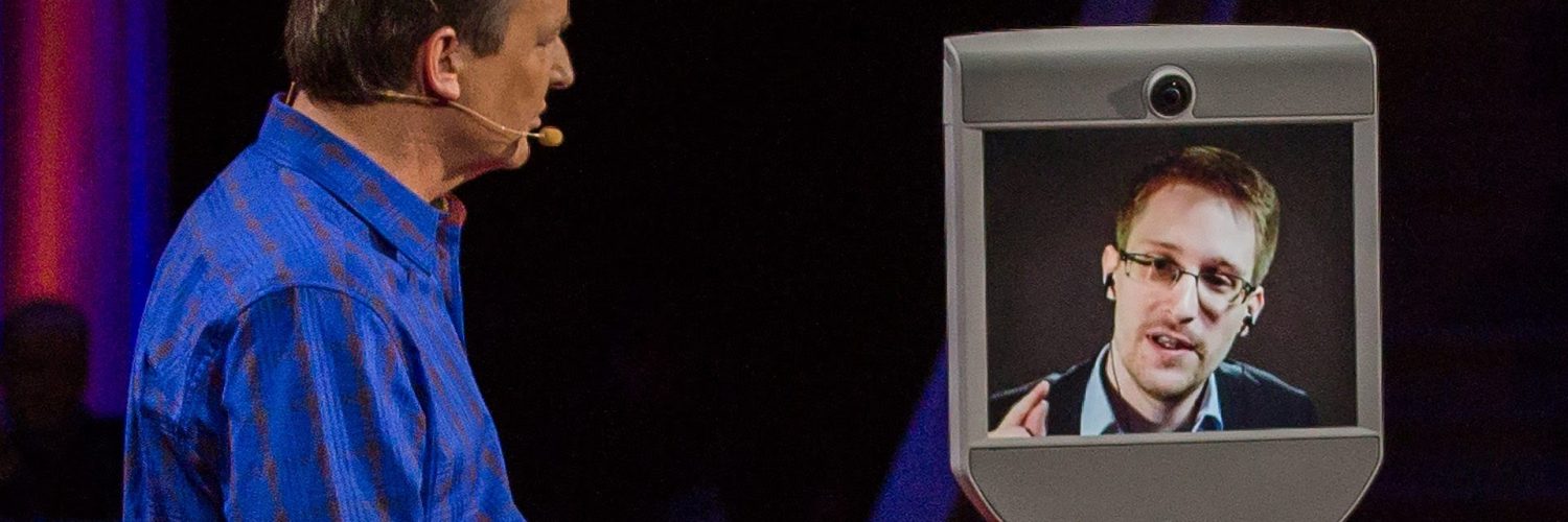 Edward Snowden speaks here to the TED2014 audience in Vancouver British Columbia from a remote location in Russia via a “telepresence robot”.