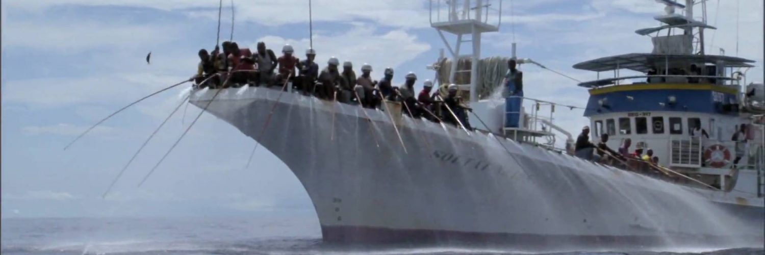The ancient practice of fishing with a rod is now practiced on an industrial scale. Water jets break up the outline of the boat and mimic the commotion of bait fish, when under attack.