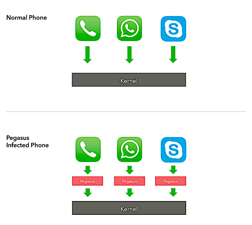 Usually, iOS security mechanisms prevent normal apps from spying on each other, but spying “hooks” can be installed on a jailbroken device. Pegasus takes advantage of both the remote jailbreak exploit and a technique called “hooking.”