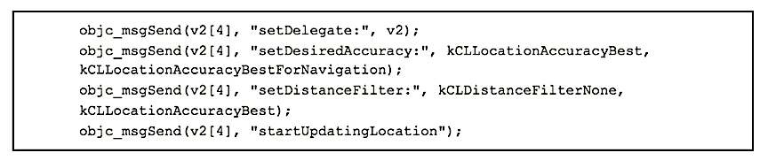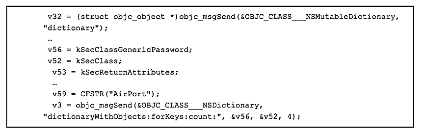 libwacalls first checks that Cydia Mobile substrate exists by attempting to load and link /usr/lib/libdata.dylib. If it isn’t present then libwacalls exits. Otherwise execution continues, resulting in the decryption of several strings that are used to identify classes and methods to be hooked.