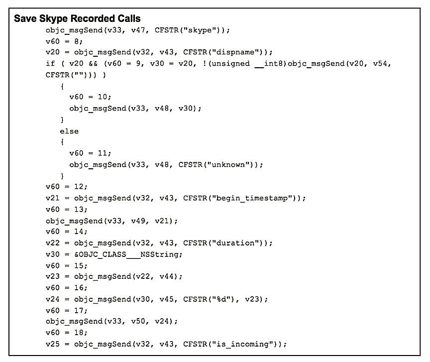 Pegasus also saves any calls that Skype has previously recorded by reading them out of the Skype database files.