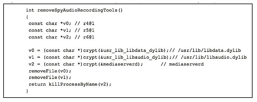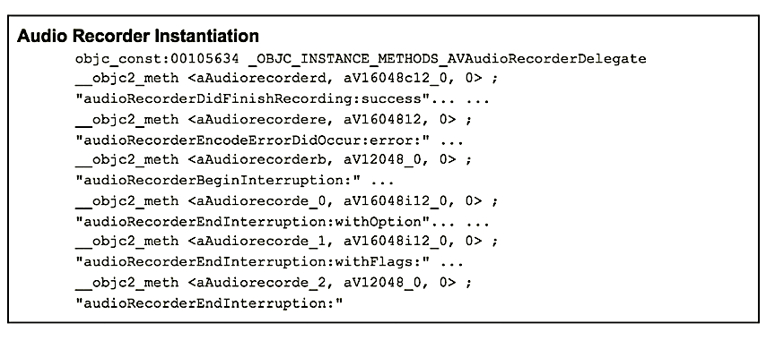 The libaudio library registers a number of notification observers that record audio when fired. These observers listen for notification IDs that get posted by various Pegasus modules. In the analyzed sample, this included notifications from the WhatsApp and Viber modules (, libwacalls.dylib and libvbcalls.dylib).