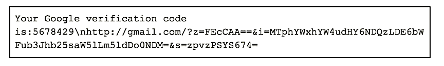 Note, these instructions mirror the structure and expected content of legitimate two-factor authentication messages identically. An example of an attacker-provided instruction via SMS (captured originally by Citizen Lab) can be seen below.