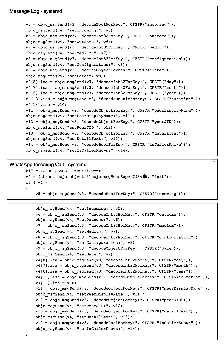 The Pegasus authors have instrumented the interception of WhatsApp messages and calls within the samples that we have obtained. In addition to logging the appropriate information for messages and calls, the software also loads a library (libwacalls.dylib) that is designed to hook key WhatsApp functions and intercept various communication types.