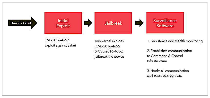 3. CVE-2016-4656: Kernel Memory corruption leads to Jailbreak – 32 and 64 bit iOS kernel-level vulnerabilities that allow the attacker to silently jailbreak the device and install surveillance software.