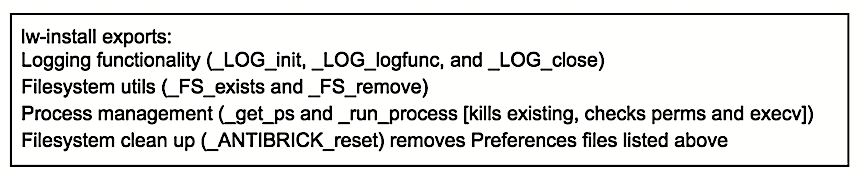 If the OS is not iOS 9, the first thing that lw-install does is remove the following files. Then it starts. Note that lw_install appears to log to /private/var/wireless/Library/com.apple.wifid.r.log