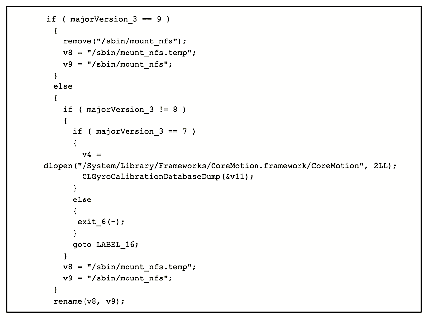 Additionally, stage 3 detects if the device was previously jailbroken through another method and, if so, removes any access to the device that the jailbreak provides, such as via SSH. The software also contains a failsafe to remove itself if certain conditions are present.