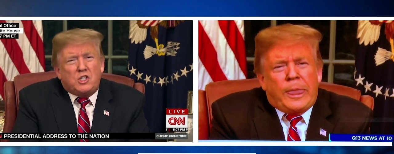 During his live announcement last Tuesday, while calling on Congress to rise above partisan politics, a visual effect that looks like Deepfake technology was keyed over the live image of Trump’s mouth. A spoofed video of his mouth blown up, slowly licking and unlicking his lips in a digital loop was superimposed over the live image.