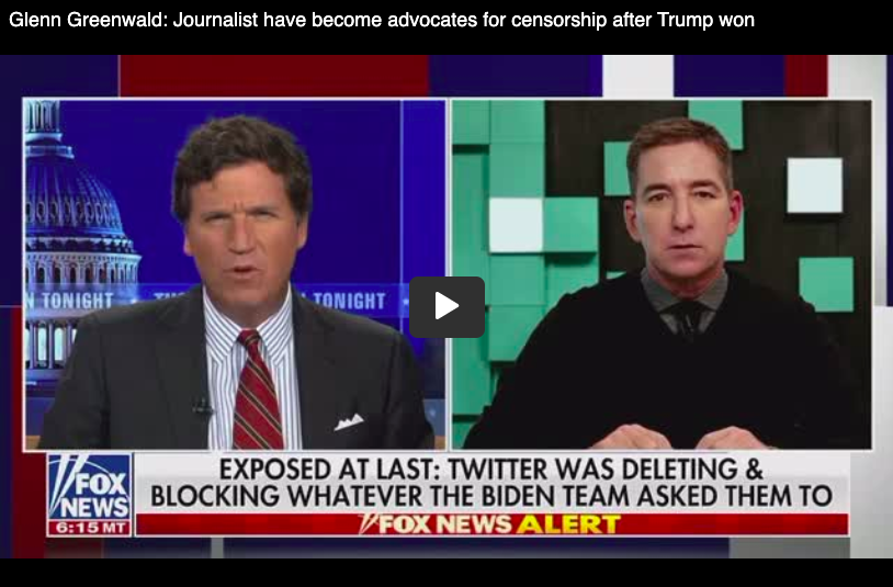 Glenn Greenwald joins Tucker Carlson to respond to Elon Musks’s tweetstorm via journalist, Mike Taibbi, in which he released the comms of Twitter executives, as they censored the facts about Hunter Biden’s laptop and how they knowingly violated the law and sought ways to evade admitting to this.