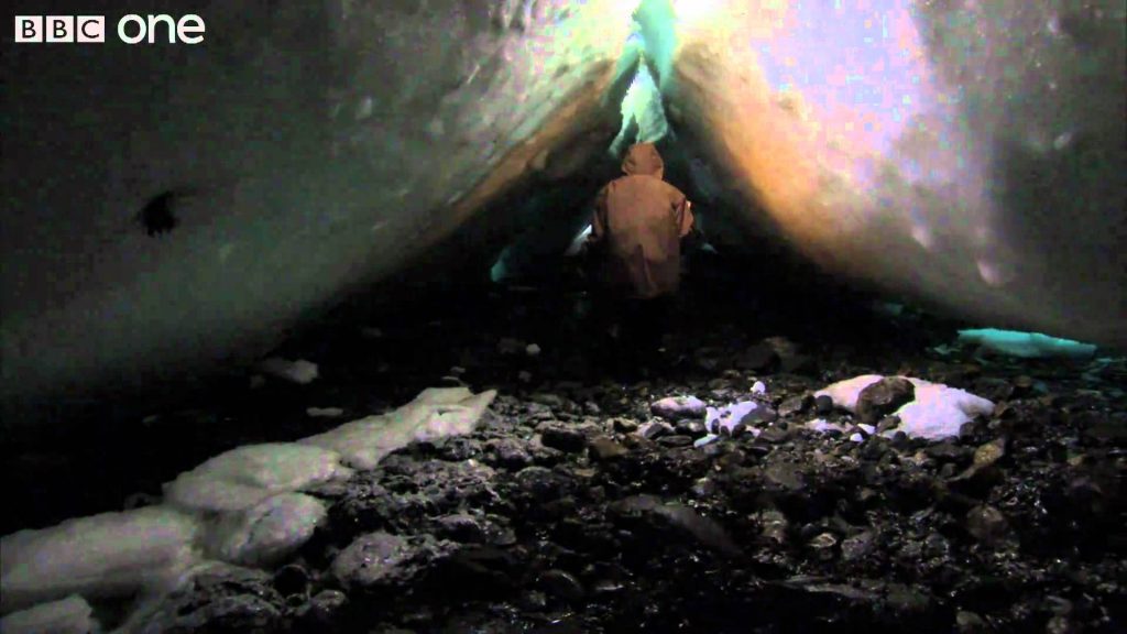 It’s a race against time. They have less than half an hour to search these temporary caverns before the tide rushes back in. A look-out keeps watch for the returning tide, but warning shouts can’t be too loud in case the echoes bring down the ice.