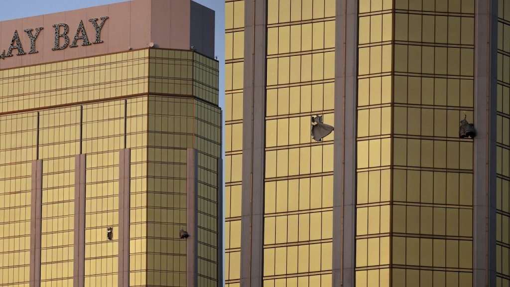 – At 35 seconds, gun flashes are reported by police to be coming from “halfway up” the tower (not near the top floor), as also seen in a separate cellphone video posted by a concertgoer on the ground.