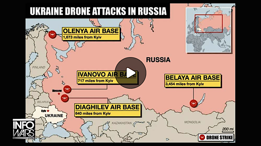 Alex Jones: So the massive attacks, Sunday night into Monday morning, all over Russia, up to 4,000 miles away from the Ukrainian border in far eastern Russia, right by Japan, are completely designed to, the night before, derail the peace talks that just concluded this morning. And of course, everyone’s waiting for the big response from Putin. If you think the Ukrainians were able to go inside Russia and then set up these trucks with false roof in them, so the roof slides back on tractor trailers, and then they can launch drones at these Russian military bases, you are gravely mistaken.