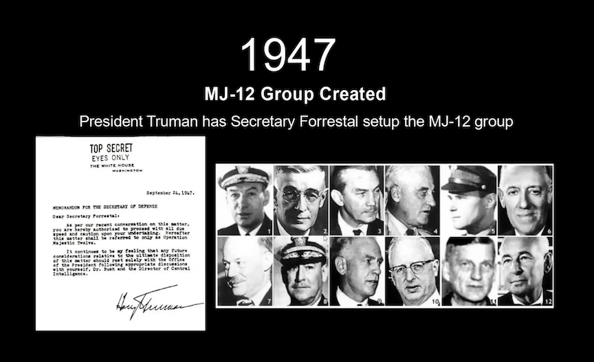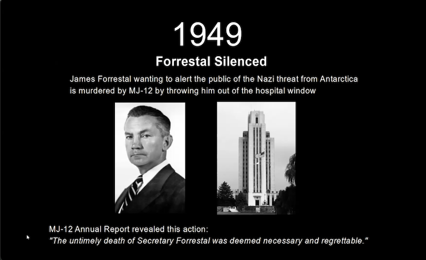 And then Forrestal, wanting the public to know about it. He's thrown out the hospital window; murdered by MJ-12, which is revealed in the annual report saying, quote, "The untimely death of Secretary Forrestal was deemed necessary and regrettable."