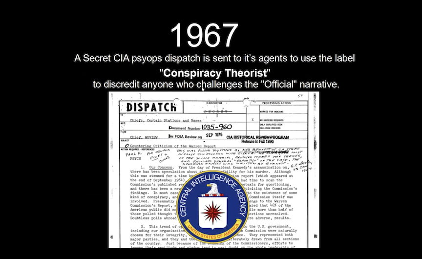 And of course, Allen Dulles heads the Warren Commission, which decides there's no conspiracy. And then, the CIA puts out the dispatch to label anybody that questions that, as a "conspiracy theorist"...