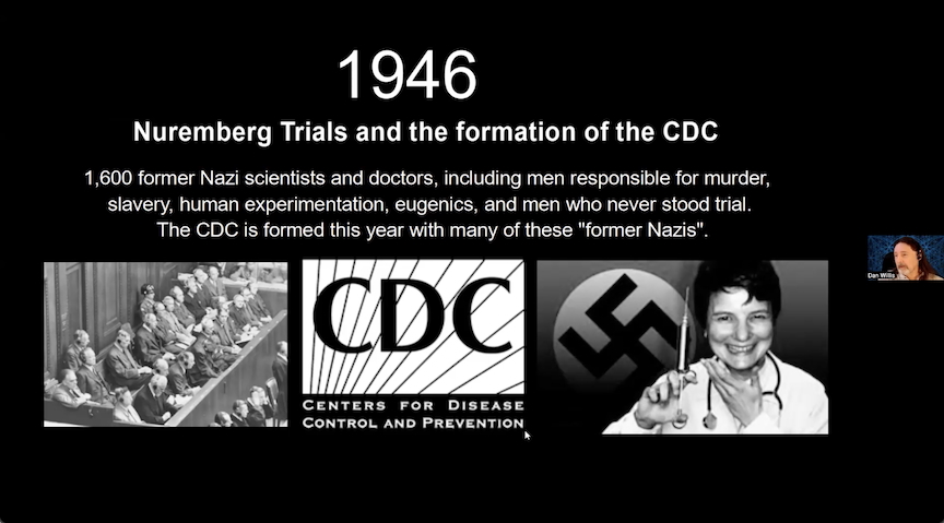 So, the end of the war, the Nuremberg Trials, 1,600 of these Nazi doctors that were responsible for murder, human experimentation, eugenics, and everything; that never stood trial, are brought into the newly-formed Center of Disease Control with many of these former Nazis!..