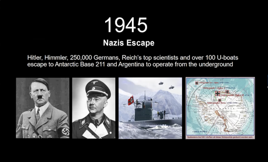 250,000 Germans, the Reich's top scientists, over 100 U-boats, all escaped down to their Antarctic base, that they created, called Base 211 in Argentina, to operate from the underground...