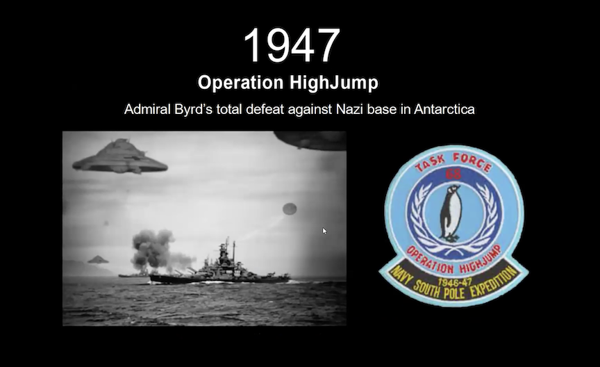 Ant the Secretary of the Navy, Forrestal sent Admiral Byrd to defeat the Nazi base down in Antarctica. All of his aircraft were wiped out, due to the Nazis having this advanced anti-gravity and Directed Energy Weapons technology.
