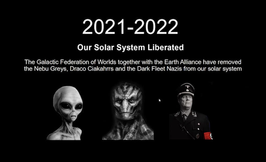 2021-2022: the Nebu Greys, the Ciakahrr [Reptilians], the Nacht Waffen, the Dark Fleet Nazis, have all been kicked out of our Solar System. Now, we only have their minions on Earth to deal with, the human elements. Their upper echelon has been decapitated. They no longer have that support.