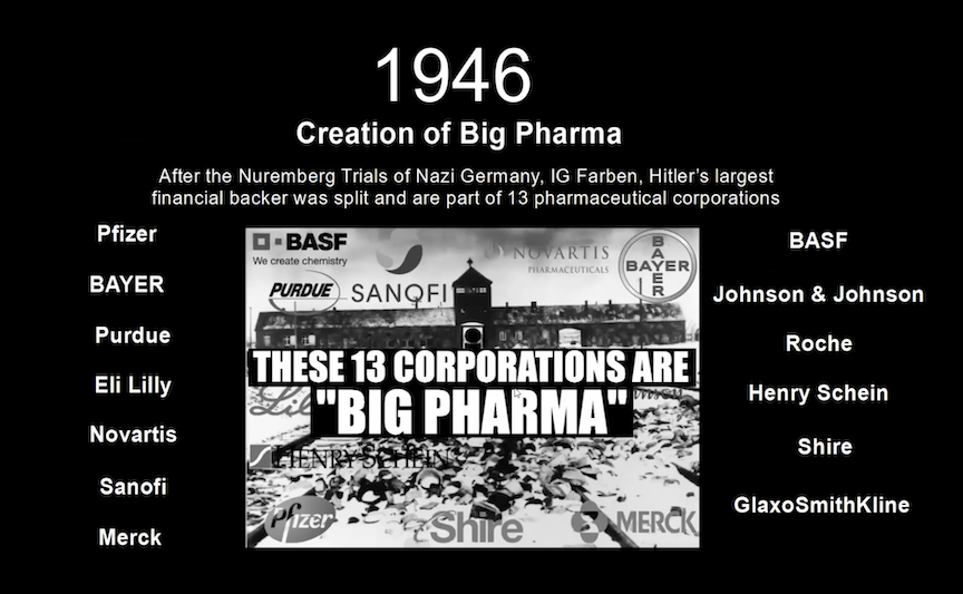 And IG Farben, Hitler's largest financial backer, was split; part of 13 pharmaceutical corporations that are Big Pharma, today: Pfizer, Bayer, [Merck] and the others, they were all part of these 13 corporations, that most of us are familiar with; these names on our television set. (Laughs) They seem to fund most of the advertising for the Mainstream Media!