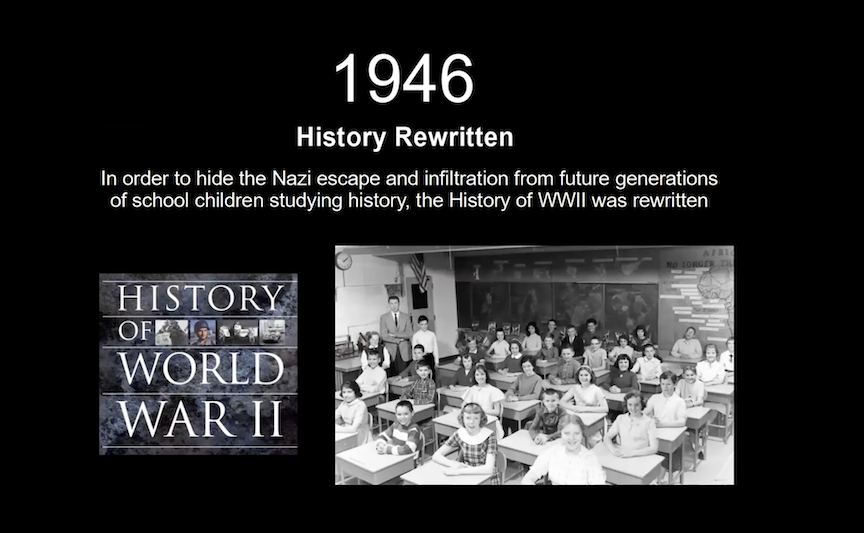 The Rockefellers, who were working almost in alliance with the Nazis, they actually rewrote – this is a bit illegal – rewrote the history of World War II, so, schoolchildren in the future, they wouldn't have a clue what happened. So, they basically cleansed the history...I guess you can say it's a Limited Hangout on the history of World War II, to hide Nazi escape and infiltration.