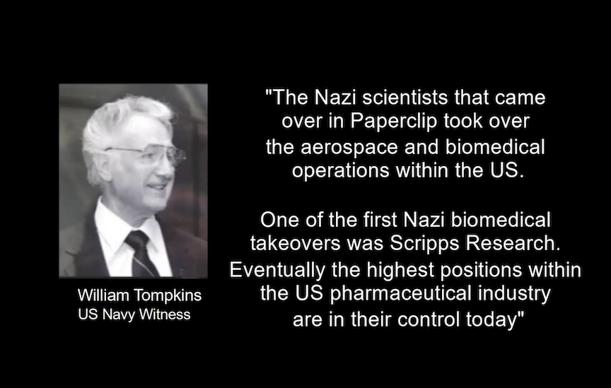 William Tompkins, a very credible witness, with much documentation to back his position, said that the Nazi scientists came in on [Project] Paperclip. They took over control of the highest positions of the US pharmaceutical industry, that are in control today.