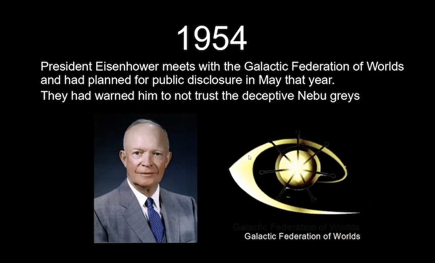 And then, a major event happened in 1954, where the Galactic Federation of Worlds met with President Eisenhower, who they warned about the deceptive Nebu Grays – that were orbiting our planet – not to trust them.