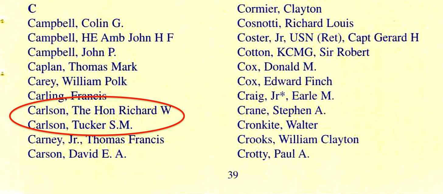 Meanwhile, Tucker Carlson is or was a member of the ultra Deep State Pilgrims Society, as was his late father, as of 2004.