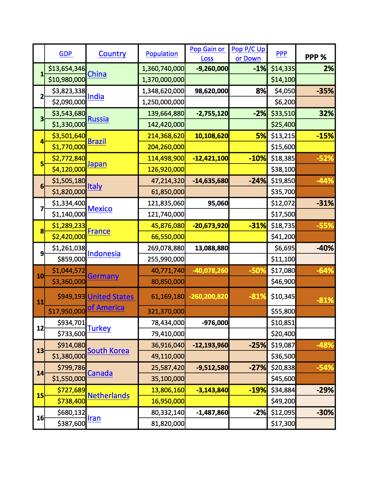 I gave color codes to show radical shifts in population and Purchasing Power Parity (PPP). "PPP" means the estimate of what the exchange rate between two currencies would have to be in order for the exchange to be at par with the purchasing power of the two countries' currencies. On this list, it's pegged to the US dollar. Brick Red means devastating changes, peach and yellow, devastating but less extreme. Green indicates improvement.