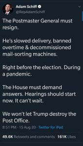 Why do you think RR, DOJ/FBI and the Dems are desperately holding out until election? They have one more ace up their sleeves ??????So little Schiffy is upset about a very specific thing, Mail Sorting Machines. That is very specific ???