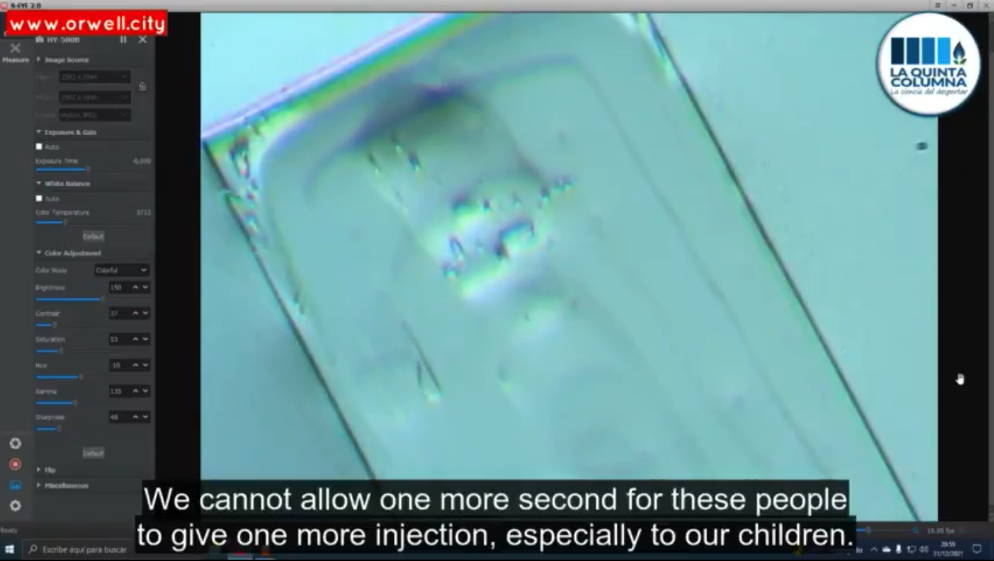 They recorded images of a perfect disk-shaped object reminiscent of those from a Pfizer vial photographed by South African microscopy expert, Dr Xandré Botha. This reportedly began to turn and spin, despite being beneath a cover plate. They also recorded a long, stringy wormlike-looking object/organism, which began to move in a particular way, as soon as it was warmed-up to human body temperature, as well as these twinned striated organisms. A Dr Young Mi Lee will supposedly be coming forward soon to make an announcement confirming these findings. Spanish biostatistician, Ricardo Delgado from La Quinta Columna did a different experiment, in which he allowed a drop of hydrogel from a Pfizer vial to dry completely and he was shocked at what he saw under 1,200X magnification. The vial contents had apparently self-assembled into what he describes as "microcircuitry" or maybe a "micro-router", which he thinks may be what causes some vaxxed people to emit a MAC address. He becomes very agitated during this video and shouts that this is the worst abomination that has ever been done to human beings. He calls for the removal of Spain's current president and he urges everyone to take his images and to file complaints against the doctors who injected them.***