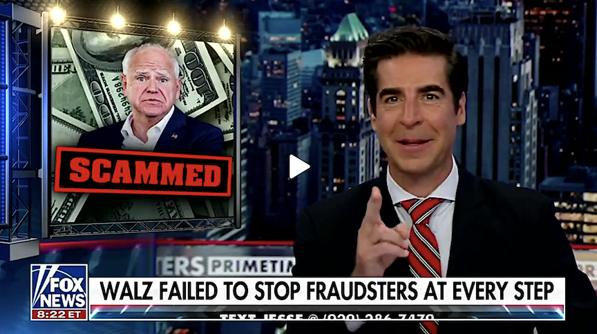 Jesse Watters: Tonight, we’re dropping another Walz bombshell. As governor, Walz let a gang of politically-connected Somali fraudsters steal a quarter billion dollars of your money. It was the single biggest COVID scam in American history.