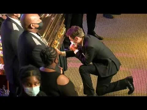 IMAGE: Maskhole Jacob Frey weeps profusely while kneeling before George Floyd's casket in 2020.