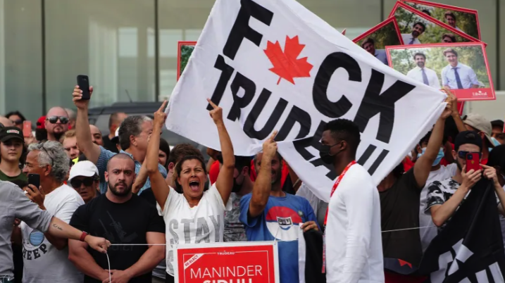 The crowd erupts in cheers and boos and spontaneous chants of “F*** Trudeau! F*** Trudeau!”