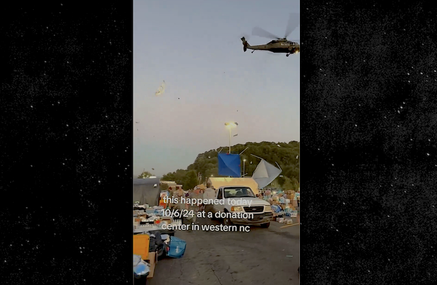 “This evening at approximately 7:18 in Burnsville, NC an unmarked helicopter flew-in and attempted to destroy the distribution area that was set up by locals for locals while I was conducting a K9 Security Round,” megsbacn, a veteran volunteer said on TT [TikTok].