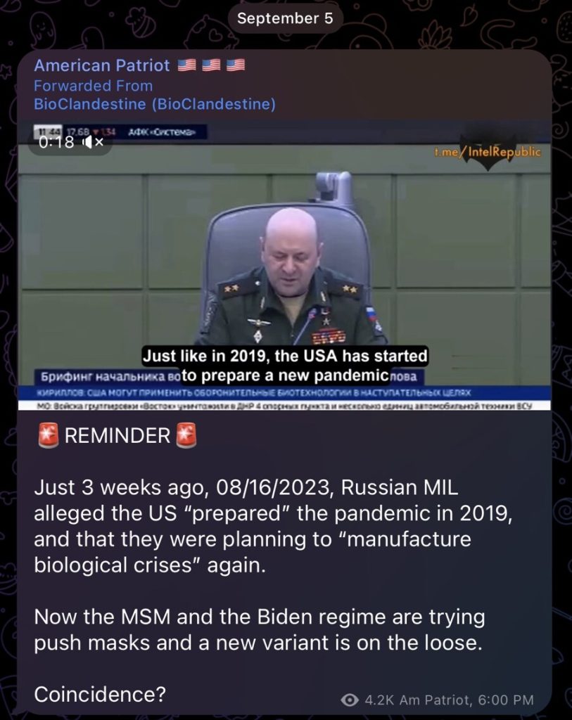 Three weeks ago, on August 16th, the Russian Ministry of Defense alleged that the US had “prepared” the pandemic in 2019 and that they were planning to “manufacture biological crises” again.